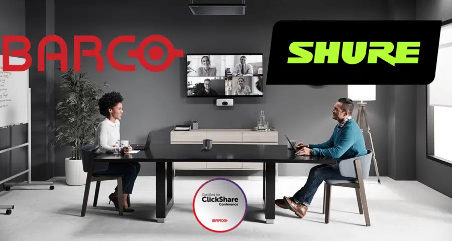 Das bedeutet für Sie: noch bessere drahtlose Videokonferenzlösungen für Ihre Besprechungsräume. Denn Sie haben nun neben beeindruckendem netzwerkfähigem Audio (DANTE) durch SHURE, auch die Möglichkeit Ihre Geräte schnell und drahtlos mit der Konferenzraumtechnik zu verbinden. So können Sie mit Hilfe von BARCO ClickShare schnell und einfach Inhalte mit beispielsweise dem Raumdisplay teilen und durch SHURE in herausragender Audio-qualität wiedergeben.
