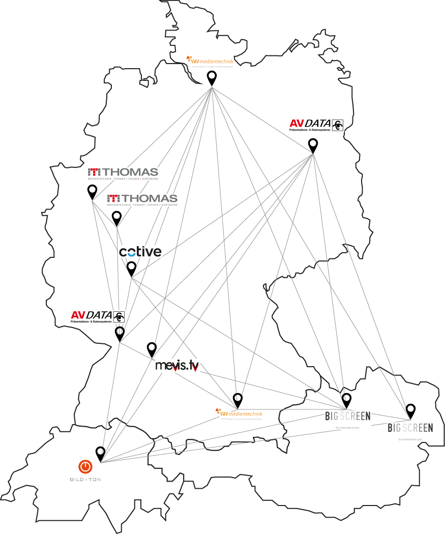 Ob Berlin, Zürich oder Wien: Wir sind täglich mit über 160 Technikern und Projektleitern in der gesamten DACH-Region für Sie im Einsatz. Insgesamt sind über 365 Mitarbeiter im Netzwerk tätig und wickeln jedes Jahr mehr als 12.000 Projekte für unsere Kunden ab. Das av.netzwerk ist mit insgesamt Unternehmen in Deutschland, Österreich und der Schweiz für Sie unterwegs.